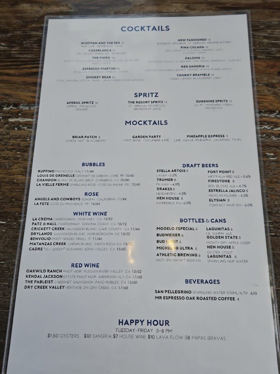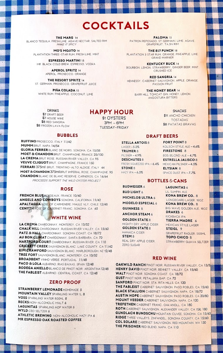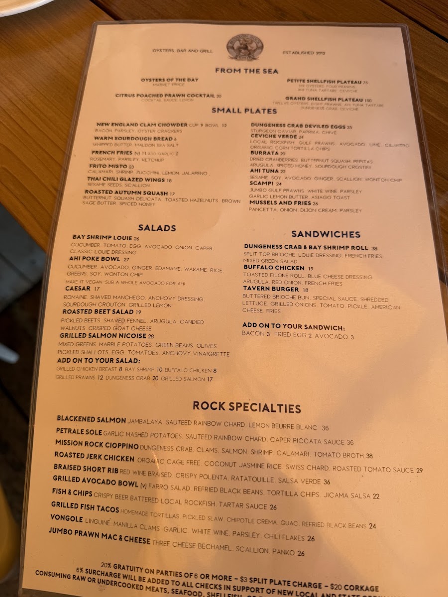 The menu showcases a delightful range of dishes that celebrate the ocean’s bounty. Start your meal with the Raw Bar offerings, where the Petite Shellfish Plateau ($65.00) awaits, featuring an enticing selection of oysters, clams, prawns, and ceviche verde. Or elevate your experience with the Grand Shellfish Plateau ($135.00) for a luxurious assortment of six oysters, Dungeness crab, and more. For those who crave heartier options, the Pan Seared Petrale Sole ($28.00) with mashed potatoes and lemon caper beurre blanc delivers a perfectly balanced dish that melts in your mouth, while the Jambalaya ($16.00) brims with shrimp, mussels, and clams, inviting a medley of flavors that dance on your palate.